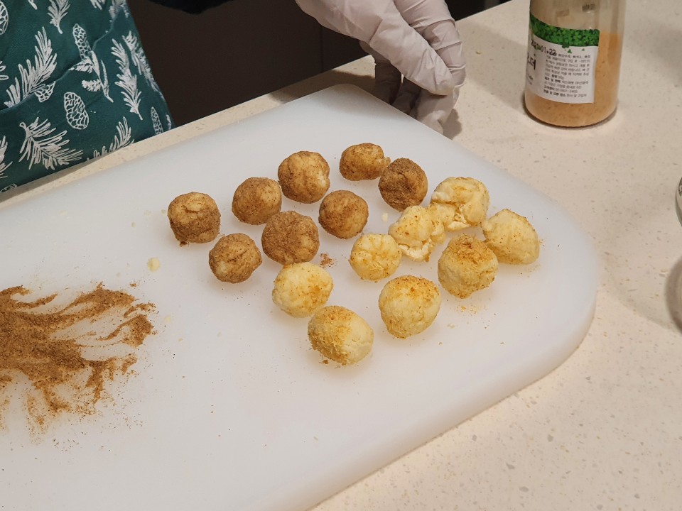 치즈경단이라는걸 만들었습니다. 출처는 저희가 구매한 오지와 함께 만드는 반려견 맞춤간식 100선이라는 책에서 보고 만들었습니다.