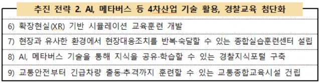 3대 추진 과제 중 하나는 AI, 메타버스 같은 신기술을 경찰교육에 도입하는 것이다. 이의 일환으로 확장현실(XR) 기반 시뮬레이션훈련 시스템을 구축할 계획인데, 경찰청은 이 시스템이 세계 최초라고 설명했다.