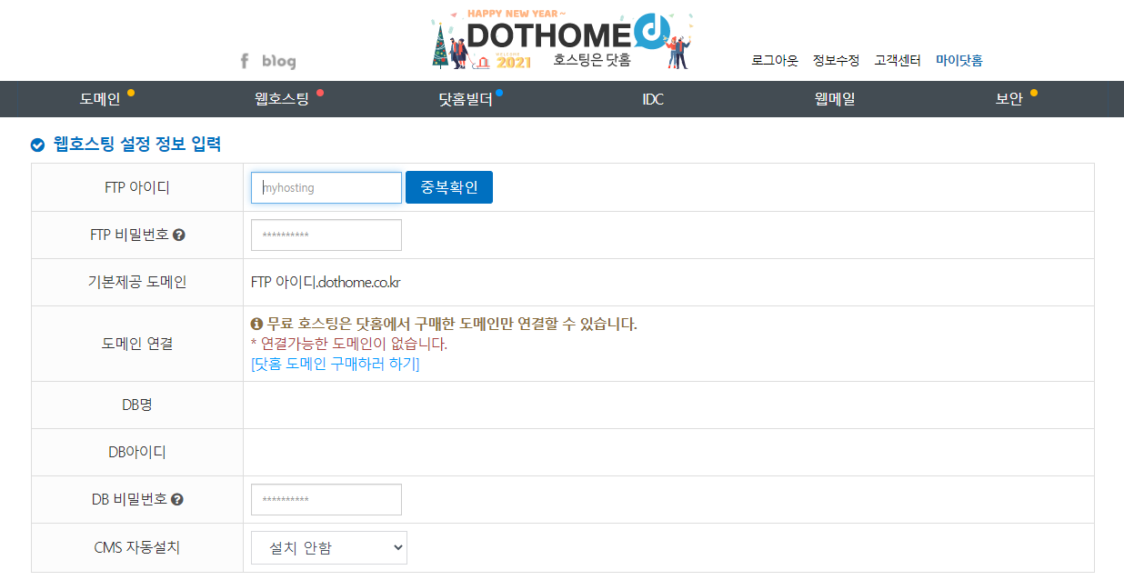 혹시라도 아이디랑 패스워드를 잊어버린 경우 닷홈에 로그인 하신후 마이닷홈에 들어가시면 현재 내가 신청 중인 호스팅 목록이 나옵니다. 거기서 상세보기를 클릭하신 후 아래로 내려오시면 웹서버/FTP 정보, DB 정보 목록이 나옵니다. 아이디를 확인하시고 패스워드는 변경하시면 됩니다. 그외에 CMS를 재설치 하거나 초기화 등 여러가지 기능이 있으니 들어가서 한번 보시는 것도 추천드립니다.