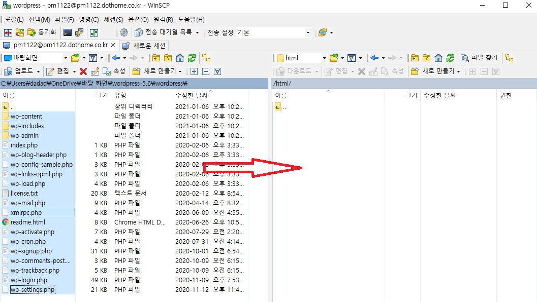 여기까지 완료 하셨다면 오른쪽 화면에 html이라는 폴더가 보이게 됩니다. 참고로 말씀드리면 위에 이미지에서 좌측부분은 현재 로컬(내컴퓨터)고 우측 부분은 호스팅 공간입니다.