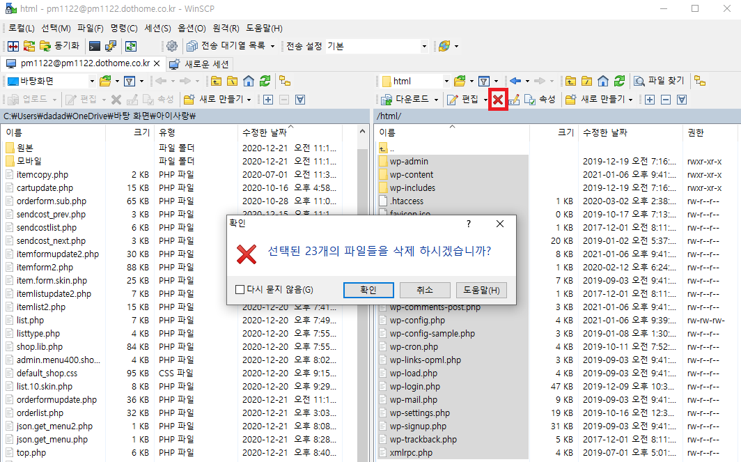 html폴더를 클릭해서 들어가시면 상단부터 wp-admin, wp-content,wp-includes등 파일이 있습니다. FTP로 업로드해서 설치하기 위해 기존에 있던 파일들을 전부 삭제해 줍니다.