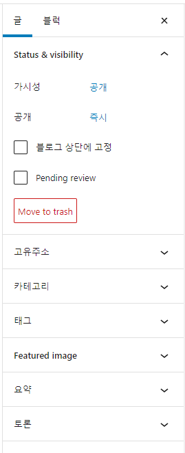제목을 입력하시고 내용을 입력하시면 됩니다. 우측에 보면 글 / 블럭이라고 있는데 위에 이미지에서 보시는것처럼 고유주소는 등록된 글의 사용될 주소고 카테고리는 현재 등록된 카테고리의 목록입니다. 지금은 카테고리를 등록하신적이 없지만 등록이 되어있을 겁니다. 이전에 가져오기로 가져왔던 xml때문입니다. 글 목록에서 하나하나 확인해 보기 위해서 다 등록해 보신다음에 공개를 누르시면 내용을 확인 해 볼 수 있습니다.